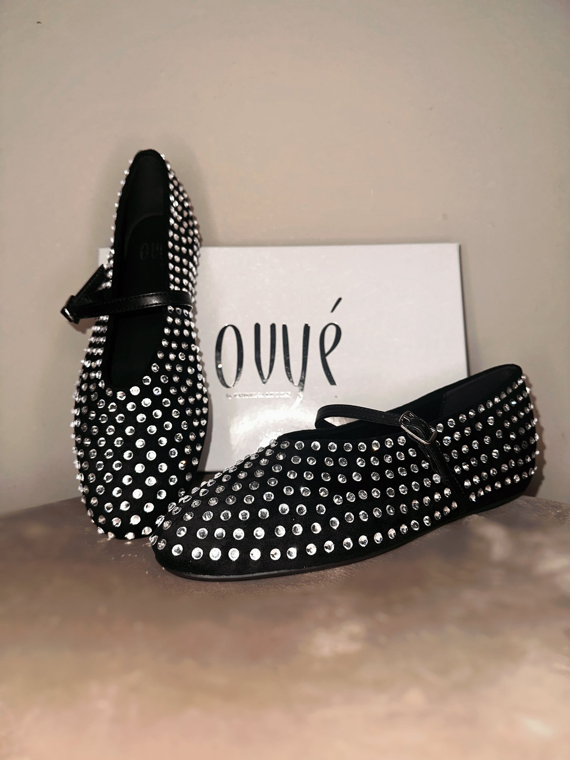 Ballerine Ovyè in camoscio nero con cinturino ed interno in vera pelle, rivestite di strass che le rendono super luminose!