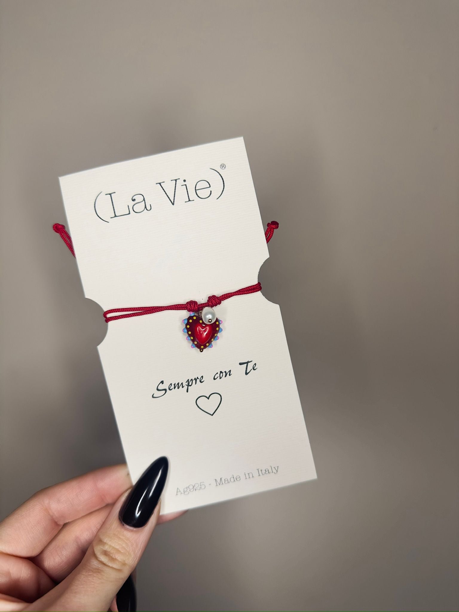 Bracciale in cordino con nodo che scorre, regolabile con charm in vetro realizzato artigianalmente.