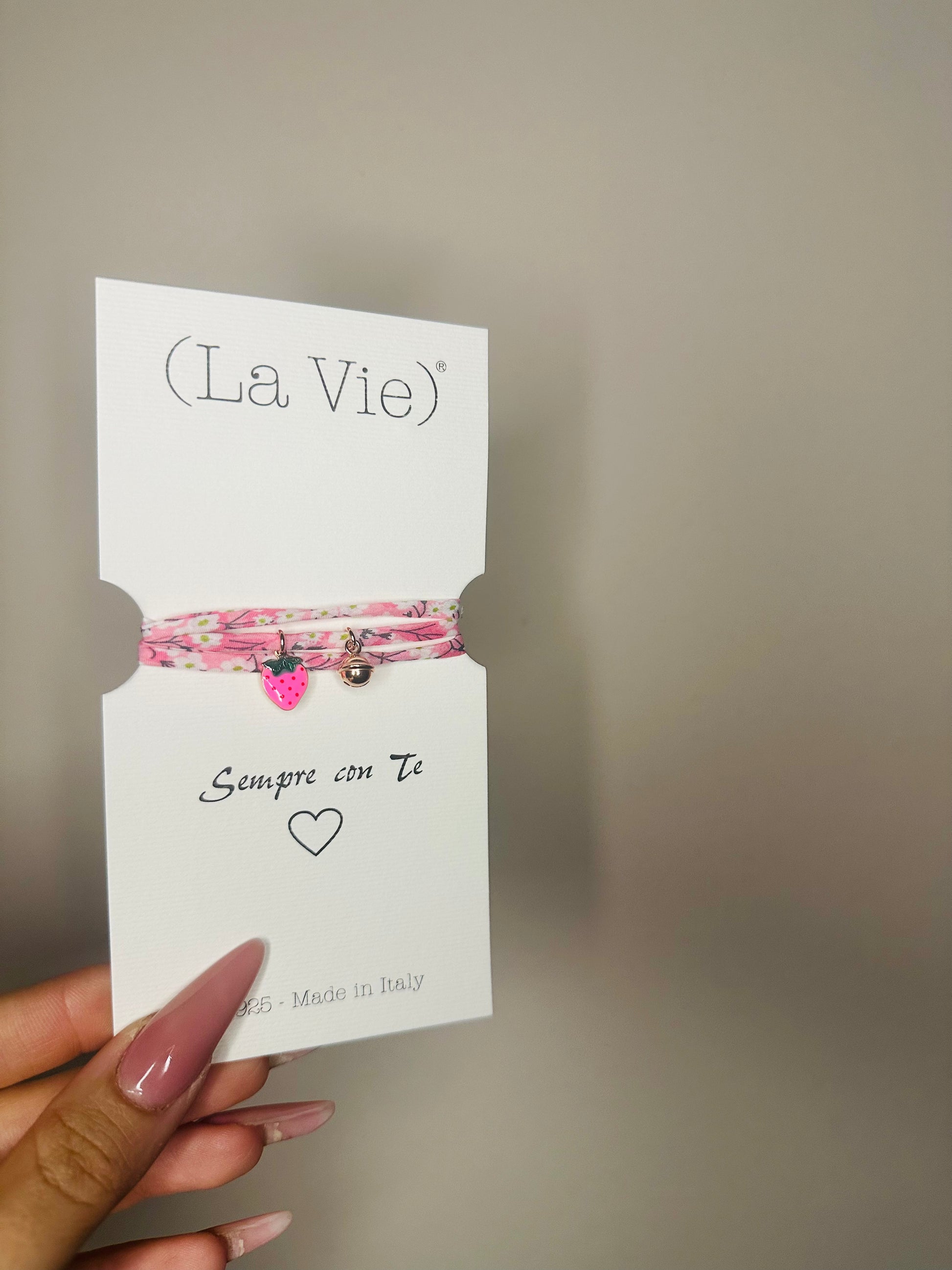 Bracciale in nastro di cotone nelle tonalità del rosa, con charm fragolina in argento 925 placcato oro rosa e campanellino.