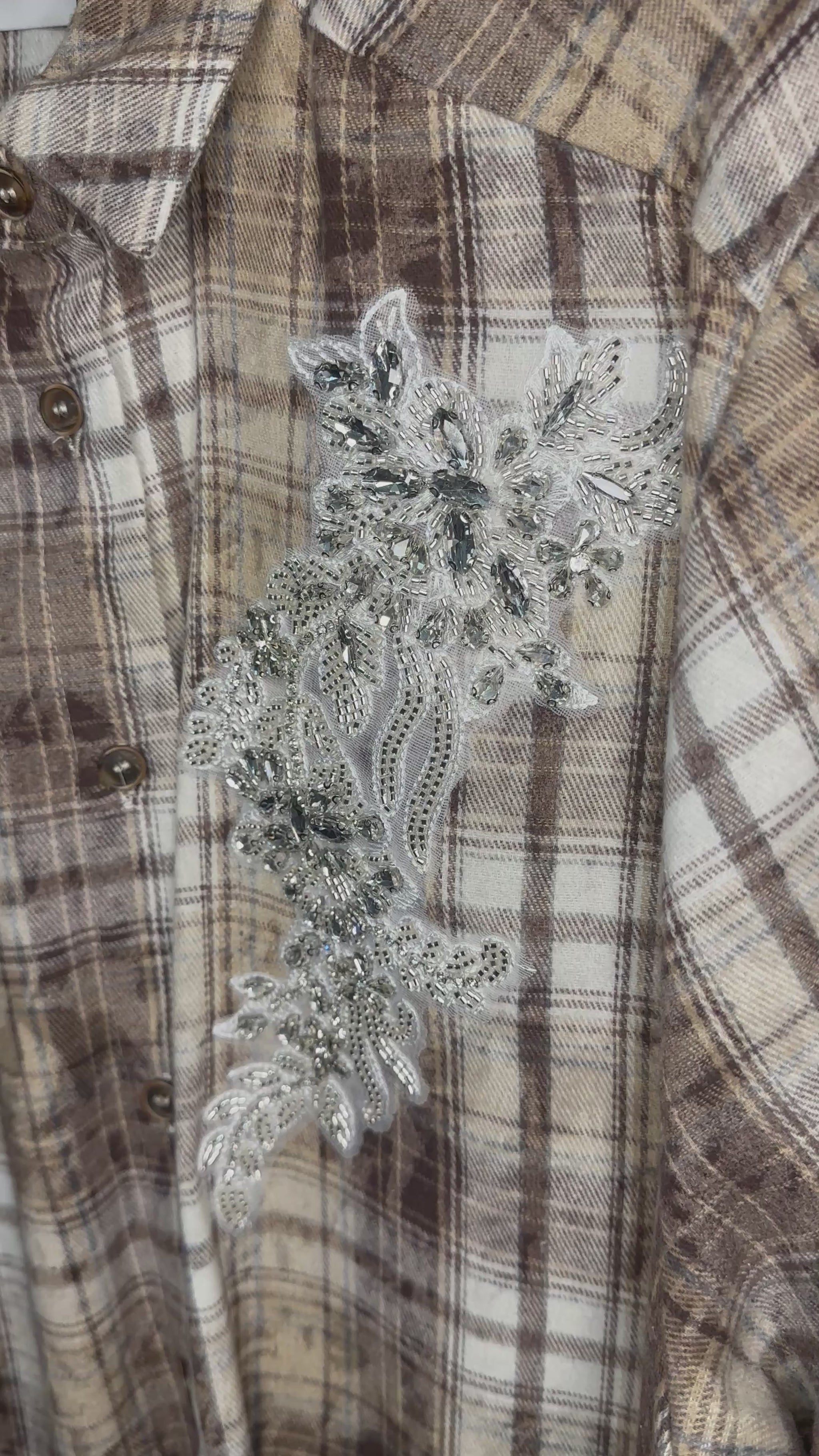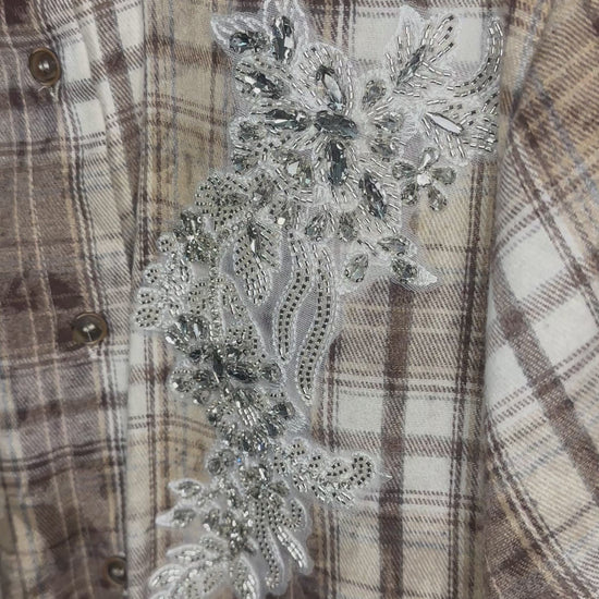Maxi camicia in flanella Haveone tonalità sabbia check con patch super luccicate applicato sul lato destro anteriore.