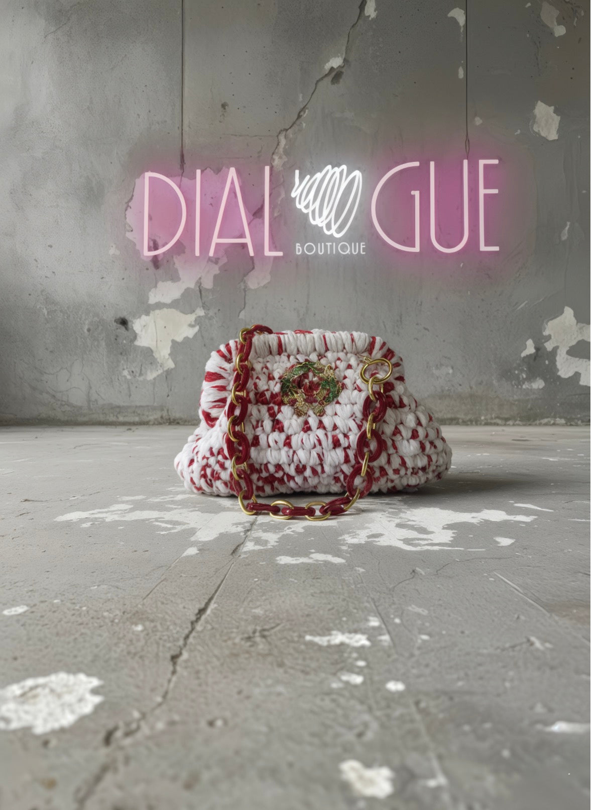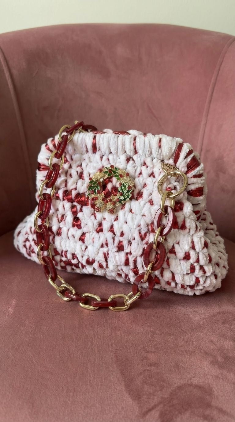 Clutch handmade colore bianco&rosso con applicazione di spilla ghirlanda e campanelle🎄