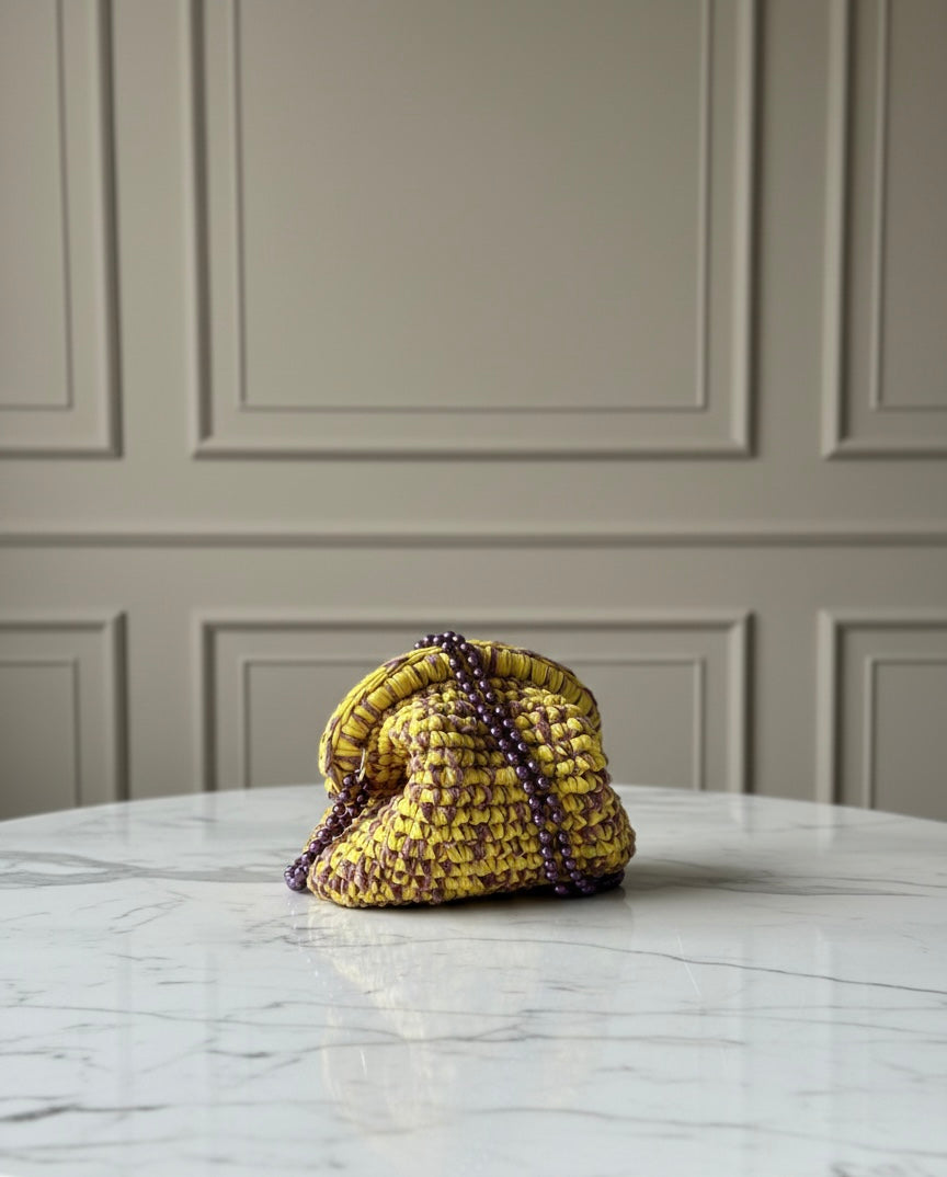 Splendida clutch con base 22cm con filati intrecciati giallo e lavanda.