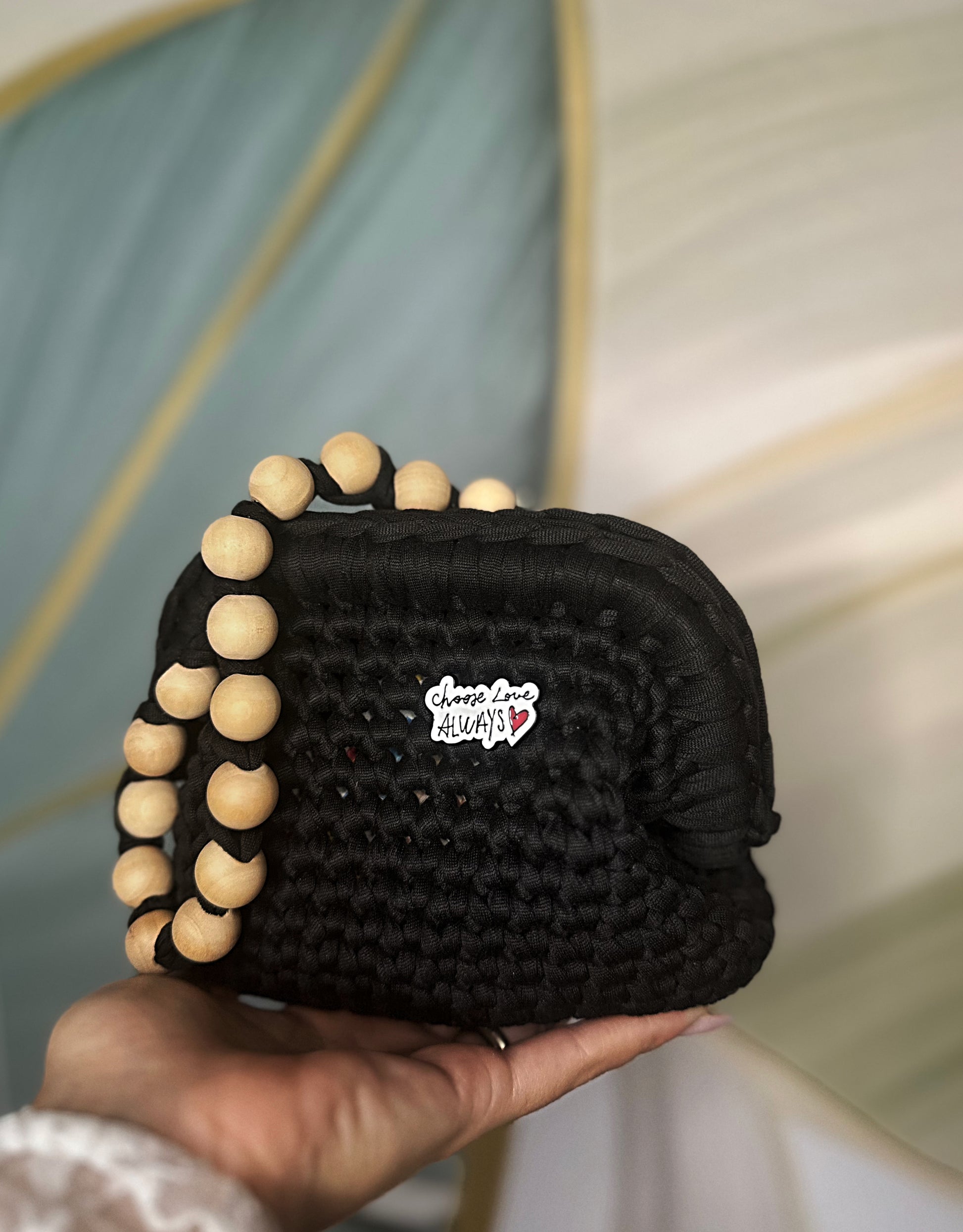 Clutch handmade colore nero ed applicazione di spilla con scritta ‘Choose love always’💞