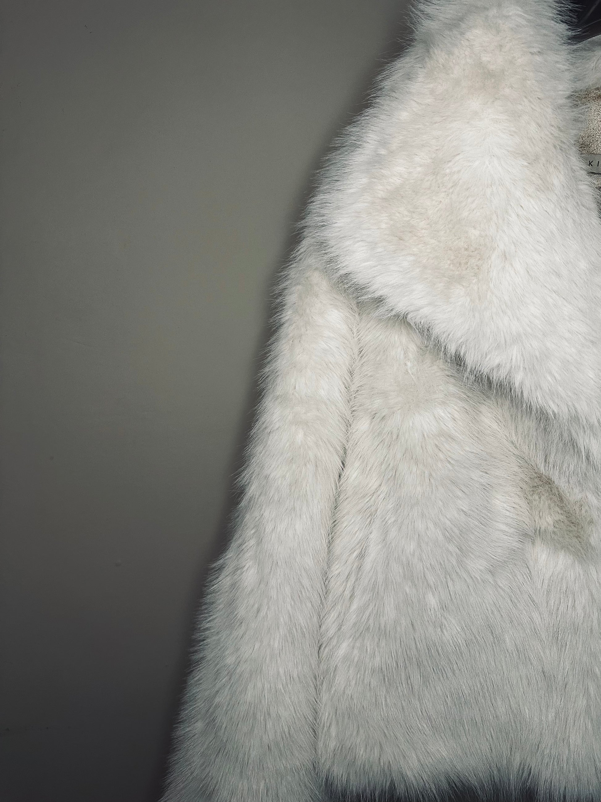 Giacca in eco-pelliccia con pelo lungo a tinta unita, collo sciallato, manica lunga e chiusura con due clip.