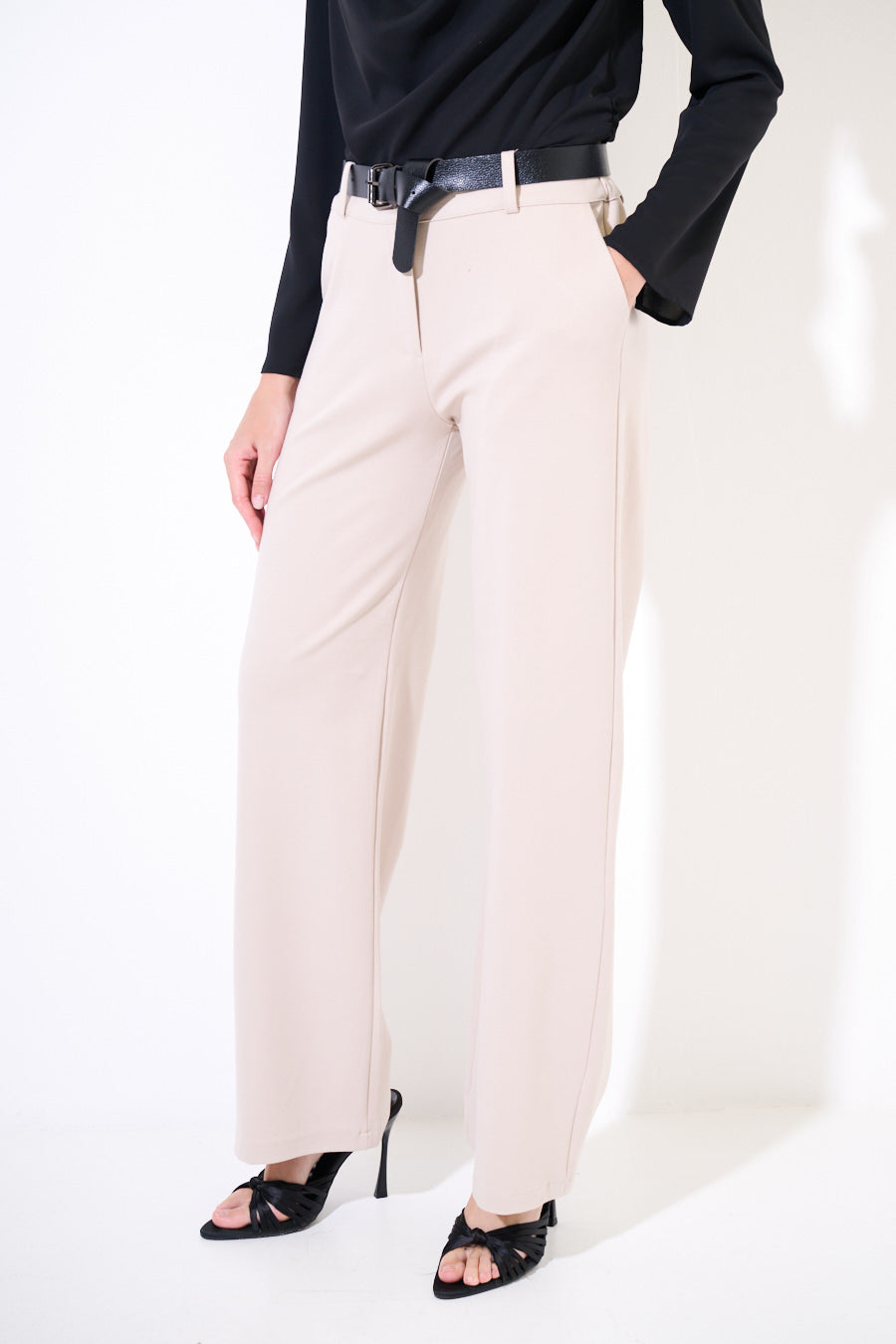 Pantalone basic punto milano a vita alta, con cintura e elastico in vita.
